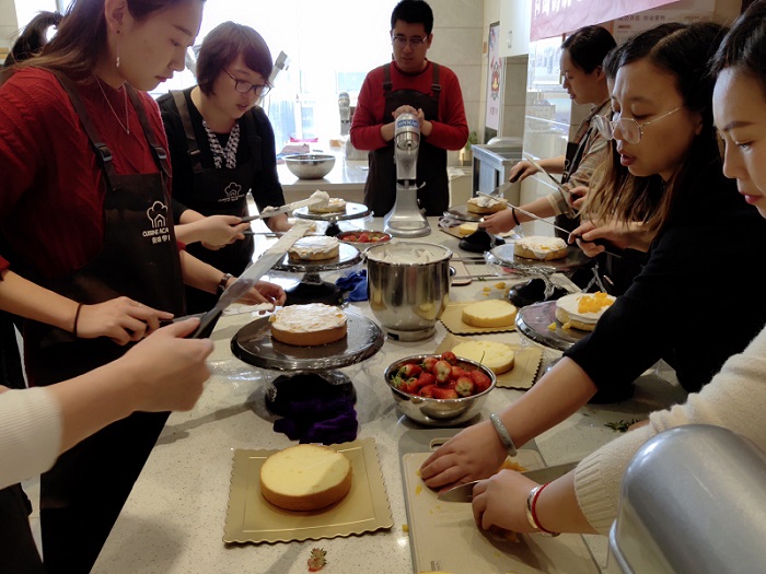 下午1點,16名女神集結一起,分別就位兩張工作臺。蛋糕胚、工具早已碼放整齊,當圍裙穿上身,蛋糕DIY活動正式拉開序幕。蛋糕老師先行打好奶油,并逐步講解制作過程,邊操作邊講解,讓創(chuàng)銳女神很快上手,無論是美食大咖還是廚藝小白架勢全都有模有樣,抑或是女神與生俱來的天生本領,抑或是創(chuàng)銳女神往日工作雷厲風行的風格積淀。